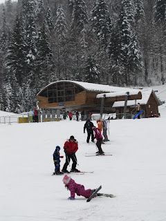 Jan, all three kids plus Mina, Mihailo's friend from next door, and I went up sledding while Jagos was an observer/photographer! We had a blast! We were sledding on like a magic carpet sled with a handle in front (they were made for little kids, so it was a tight squeeze for me!) or "butt plates" I like to call them, and we were also using what is called a "snow tiger," it is a higher sled, that has runners or skis on the sides to help you go faster and over the rough terrain! haha We went up one hill and it was not very big, but there were rocks and the snow was powdery, so we could feel just about everything.